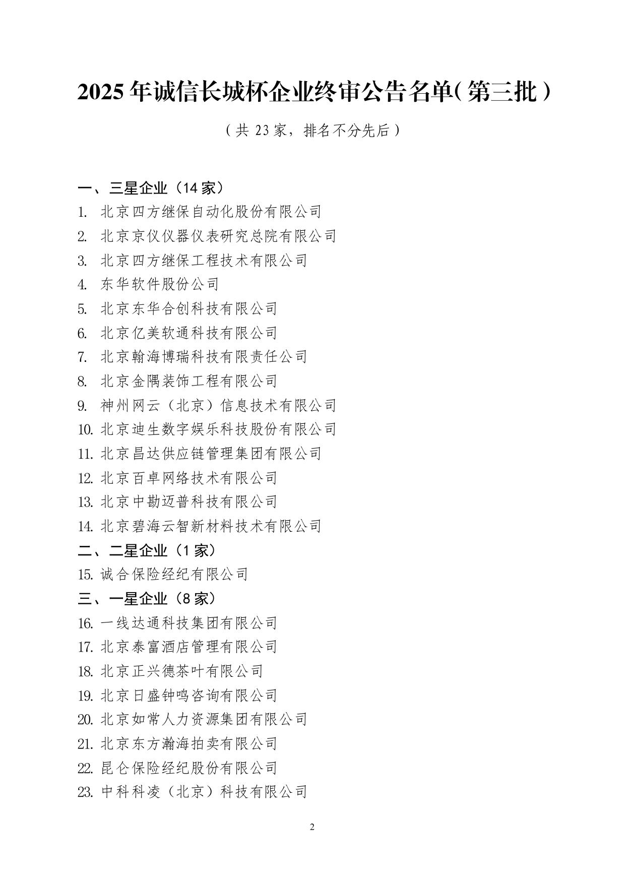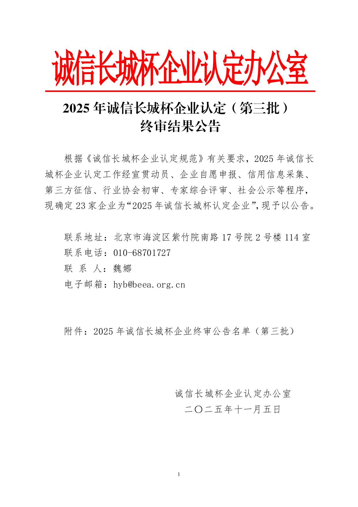 2025年诚信长城杯企业认定(第三批)终审结果公告