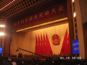 中共中央、国务院1月14日上午在北京隆重举行国家科学技术奖励大会。党和国家领导人胡锦涛、温家宝、李长春、习近平、李克强出席大会并为获奖代表颁奖。温家宝代表党中央、国务院在大会上讲话。李克强主持大会。